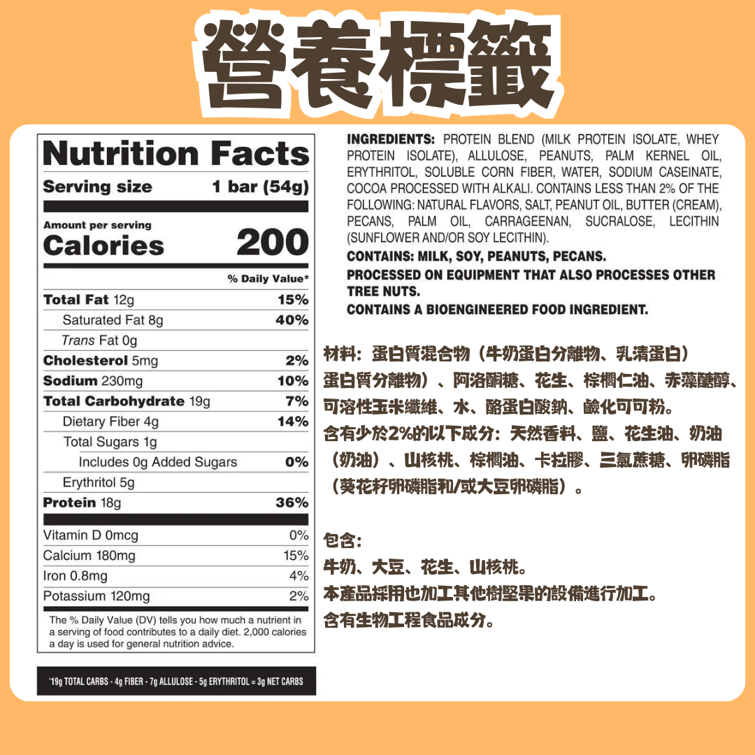 Protein blend (Milk Protein Isolate, Whey Protein Isolate), Allulose, Palm Kernel Oil, Peanuts, Erythritol, Soluble Corn Fiber, Water, Sodium Caseinate, Cocoa Processed with Alkali. Contains Less Than 2% of the following: Natural Flavors, Sea Salt, Sunflower Oil, Baking Soda, Peanut Oil, Butter (Cream), Pecans, Inulin, Palm Oil, Carrageenan, Sucralose, Sunflower Lecithin.